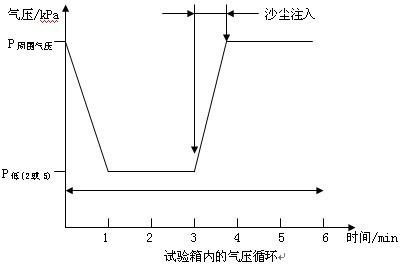 試驗用塵:試驗用塵是干燥的非磨蝕性的細粉塵,能夠通過篩孔為75µm,金屬絲直徑為50µm的平面網(wǎng)狀篩。本試驗中可以使用滑石粉,分析表明它可以滿足要求。試驗用塵使用次數(shù)不應超過20次。應注意維持干燥以保持粉塵細度,使用前應在80℃下烘干2h. 塵濃度:試驗用塵的數(shù)量應能夠使箱底基準表面上的沉降量均勻維持在(600±200)µ/(m²•h)。 氣流:試驗箱內的氣流應主要是自上而下的垂直氣流,而非層流。 氣流速度:氣流速度應能夠使塵在試驗箱內均勻分布。 濕度:試驗箱內的相對濕度應小于15%?梢酝ㄟ^提高試驗箱濕度實現(xiàn)。 樣品內氣壓:根據(jù)樣品的運行條件,樣品外殼可以分為兩種類型: 類型1:樣品外殼內的氣壓可能會與外界大氣壓不同,例如由運行中的熱力循環(huán)引起氣壓不同。 類型2:樣品外殼內的氣壓跟外界氣壓相同。 相關規(guī)范應闡明樣品外殼類型和壓力降。 砂塵試驗箱對于具有類型1外殼的樣品,應放入試驗箱,并按照正常使用位置安裝。樣品應承受圖中規(guī)定的壓降周期。根據(jù)相關規(guī)范中規(guī)定,壓力降應為2kPa(20mbar)或5kPa(50mbar) 。 如圖所示,塵應在每個循環(huán)周期內注入。 對于具有類型2外殼的樣品,應放入試驗箱,并按照正常使用位置安裝。此種情況下,不應使用真空泵。