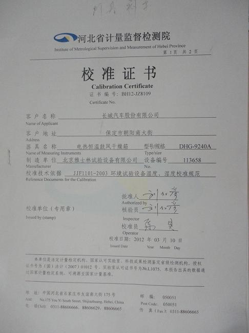 >>電熱恒溫鼓風(fēng)干燥箱校準(zhǔn)證書(shū)-河北計(jì)量院-長(zhǎng)城汽車(chē)