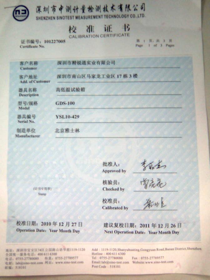 ·高低溫濕熱試驗箱校準證書-深圳中測計量-深圳精銳通