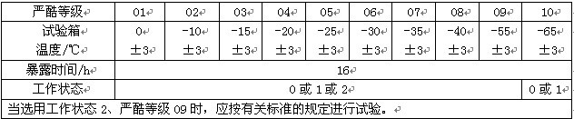 |     恒溫恒濕試驗箱試樣在恒應(yīng)力狀態(tài)暴露期間,溫度變化應(yīng)十分緩慢以防止試樣損壞。用條件試驗方法11或12時,溫度變化階段應(yīng)保持最大的相對濕度,并在有關(guān)標準中說明試樣上是否允許出現(xiàn)凝露。恒溫恒濕試驗箱適用于航空航天產(chǎn)品、信息電子儀器儀表、材料、電工、電子產(chǎn)品、各種電子元氣件在高低溫或濕熱環(huán)境下、檢驗其各性能項指標。條件試驗10方法:低溫(下圖為條件試驗方法10低溫的嚴酷等級表)
