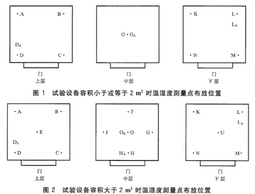 恒溫恒濕試驗(yàn)箱濕度測(cè)量?jī)x器采用干濕球溫度計(jì)或由其他濕度傳感器組成的濕度測(cè)量系統(tǒng),其測(cè)量結(jié)果的擴(kuò)展不確定度不大于被測(cè)溫度允許偏差的1/3。 恒溫恒濕試驗(yàn)箱濕度測(cè)量點(diǎn)數(shù)量及位置要求: 一,根據(jù)試驗(yàn)設(shè)備容積的大小,將工作空間分為上、中、下三層,中層通過(guò)工作空間幾何中心點(diǎn),將一定數(shù)量的相對(duì)濕度傳感器布放在其中規(guī)定的位置上,傳感器不應(yīng)受冷熱源的直接輻射。 二、相對(duì)濕度測(cè)量點(diǎn)用Oh、Dh、Hh、Lh表示。Oh位于中層的幾何心心,其他各測(cè)量點(diǎn)與試驗(yàn)設(shè)備內(nèi)壁的距離為各自邊長(zhǎng)的1/10,但最大距離不大于500mm,最小距離不小于50mm。 三、恒溫恒濕試驗(yàn)箱容積小于或等于2m3時(shí),相對(duì)濕度測(cè)量點(diǎn)為3個(gè),如圖1所示。試驗(yàn)箱容積大于2m3時(shí),相對(duì)濕度測(cè)量點(diǎn)為4個(gè),如圖2所示。當(dāng)試驗(yàn)箱容積小于0.05 m3或大于50 m3時(shí),可適當(dāng)減少或增加測(cè)量點(diǎn)。 四、每5min溫度平均變化速率測(cè)量點(diǎn)為工作空間幾何中心點(diǎn)。