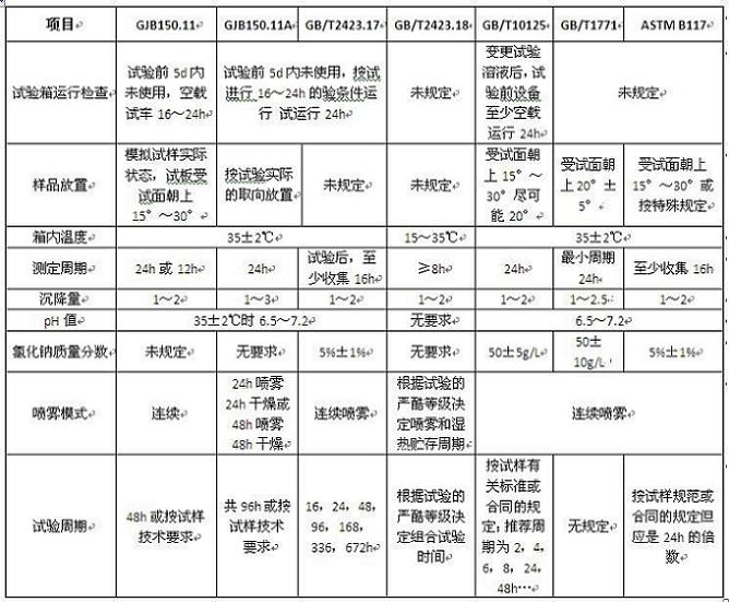 鹽霧試驗箱要保證試驗結果的正確性,必須控制好試驗過程。試驗過程的控制包括:試驗箱運行檢查、樣品放置、箱內暴露區(qū)溫度、沉降液的參數(shù)(沉降量、PH值和氯化鈉質量濃度)等,不同標準對鹽霧試驗過程的控制要求見下表: