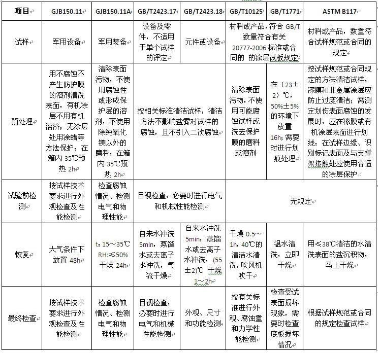 鹽霧試驗箱的試樣主要有試片(試板)和產(chǎn)品(含零部件、元器件)兩類。各種標準對試樣的種類有不同的規(guī)定,對試樣的數(shù)量一般沒有具體規(guī)定,詳細要求見下表: