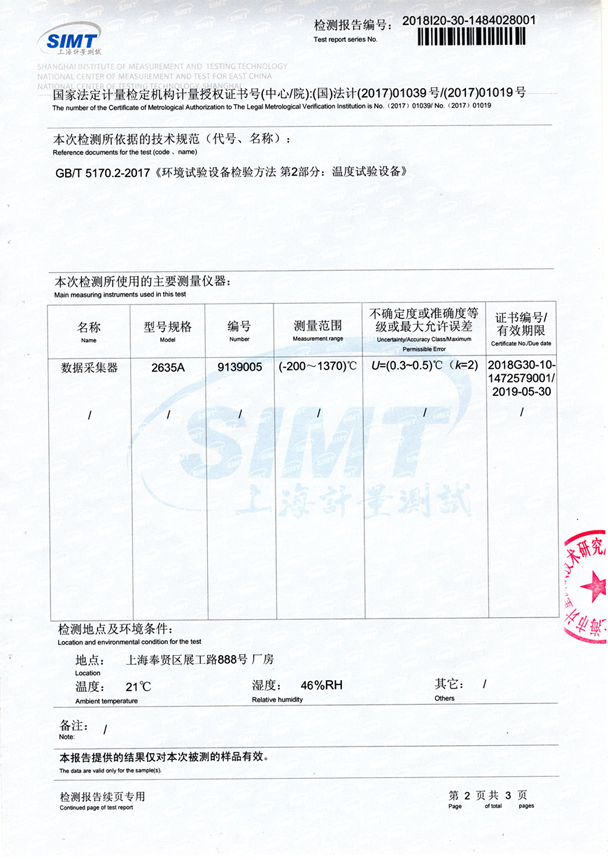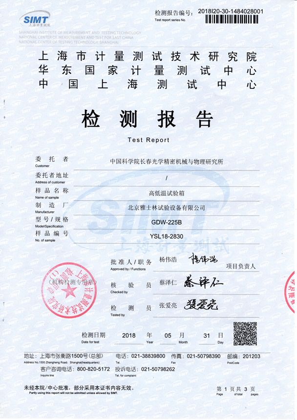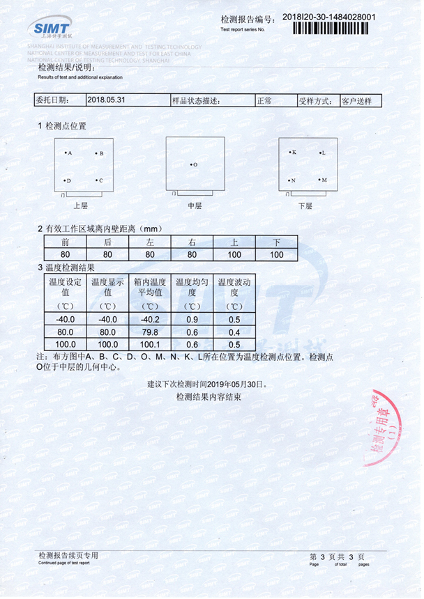 高低溫試驗箱在首次投入使用前,應(yīng)對可反映設(shè)備性能的相關(guān)參數(shù)進行詳細(xì)確認(rèn)及測試,在日常使用中則應(yīng)依據(jù)所使用的試驗方法進行對試驗參數(shù)的要求,需確認(rèn)其性能是否滿足試驗參數(shù)的要求。更多的用戶會選擇由第三方檢測機構(gòu)進行檢測,并出廠檢測報告,如下: